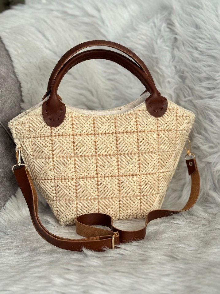Bej renkli örgü dokulu bohem tarzda kadın çanta, deri saplı ve çıkarılabilir askıya sahip, günlük kullanıma uygun canvas çanta