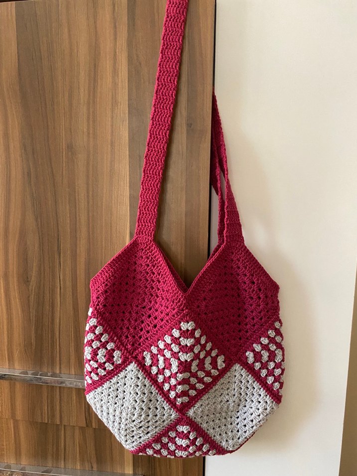 Örgü kumaştan yapılmış, dantel detaylı bohem tarzda kadın çantası. Pembe ve gri renklerde, günlük kullanım için uygun.