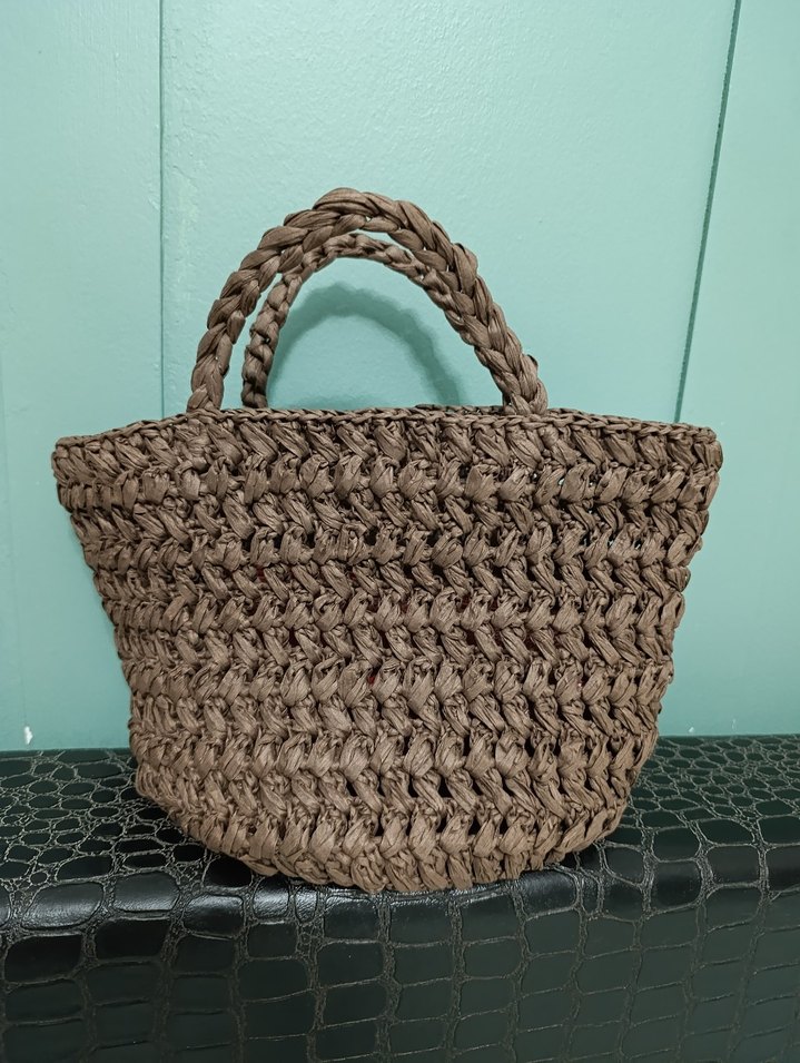 Örgü kahverengi, bohem tarzda kadın çanta. Örgülü sapları ve yumuşak dokusuyla günlük kullanıma uygun minimalist tasarım. Rafya ip çanta, yüksekliği 21 cm.