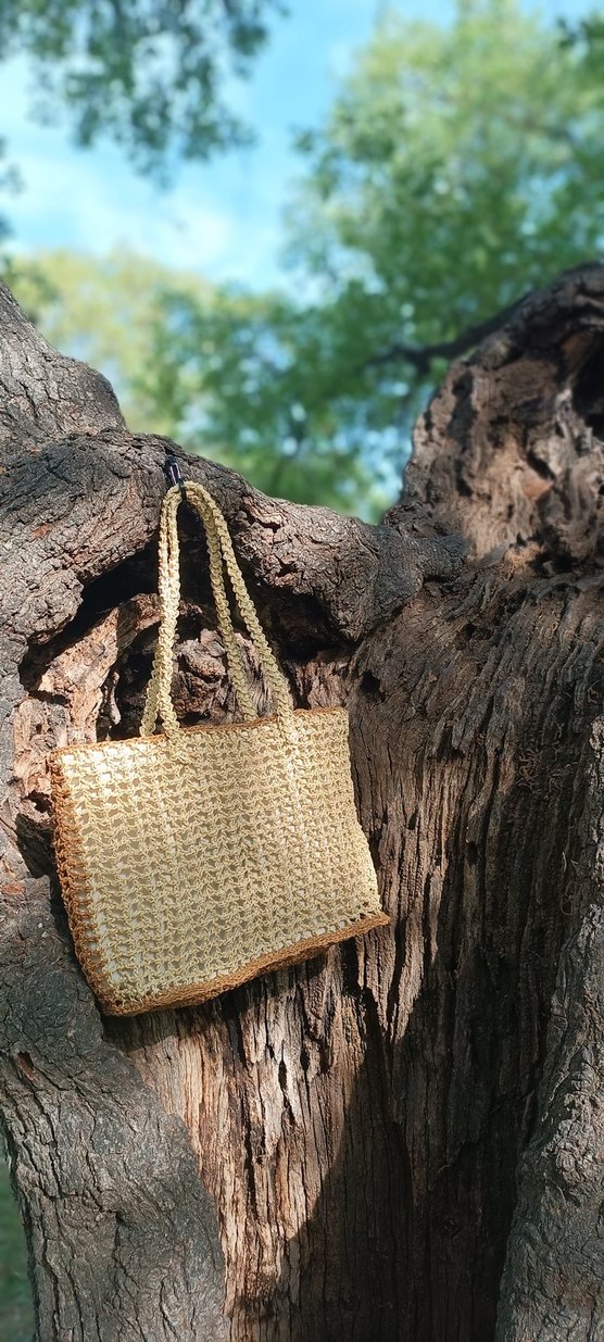 Açık kahverengi, örgü dokulu, minimalist ve bohem tarzda kadın çantası, günlük kullanım için uygun.