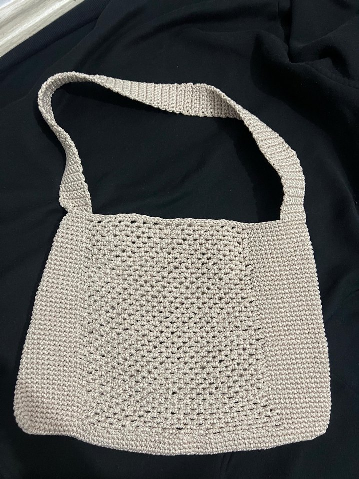Kadın çantası, beyaz ve gri tonlarda örgü dokusuyla minimalist ve bohem tarz sunar. Düz desensiz, yumuşak örgü kumaşı günlük kullanıma uygundur.