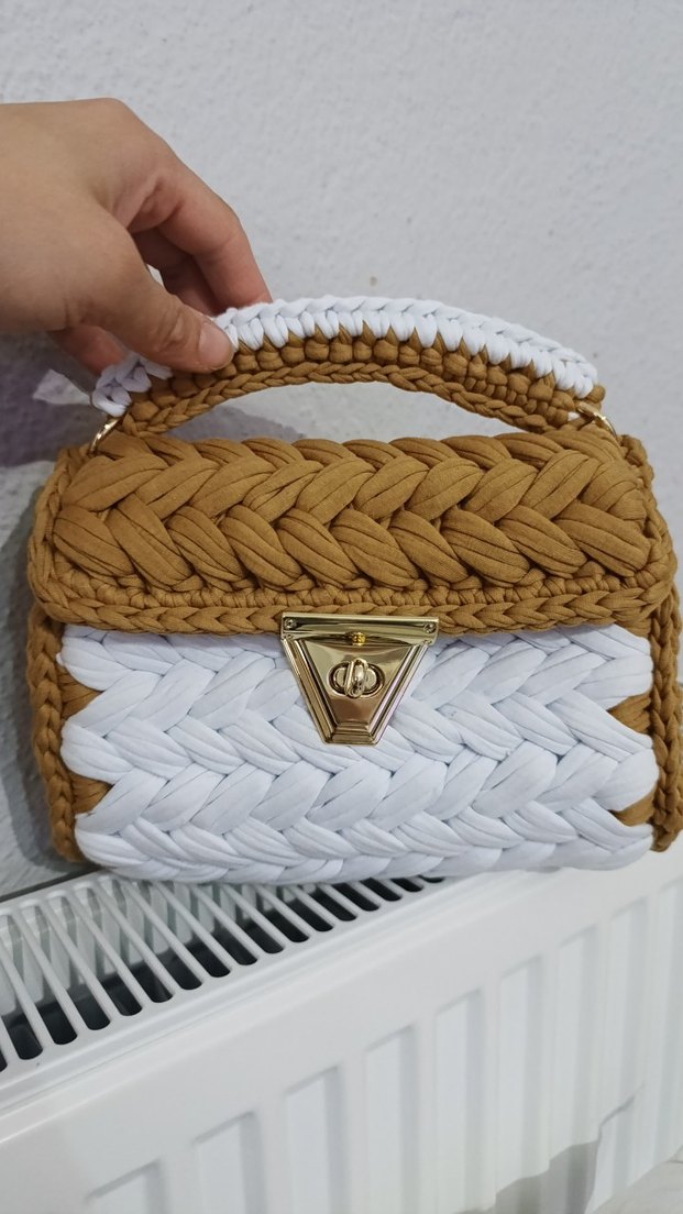 Kıyafetlerinizle harika uyumu yakalayabileceğiniz efsane bir çanta. Bohem tarzda kadın çanta, beyaz ve kahverengi tonlarda örgü tasarıma sahip. Altın renkli kilit ve sağlam sap içerir. Günlük kullanım için uygundur.