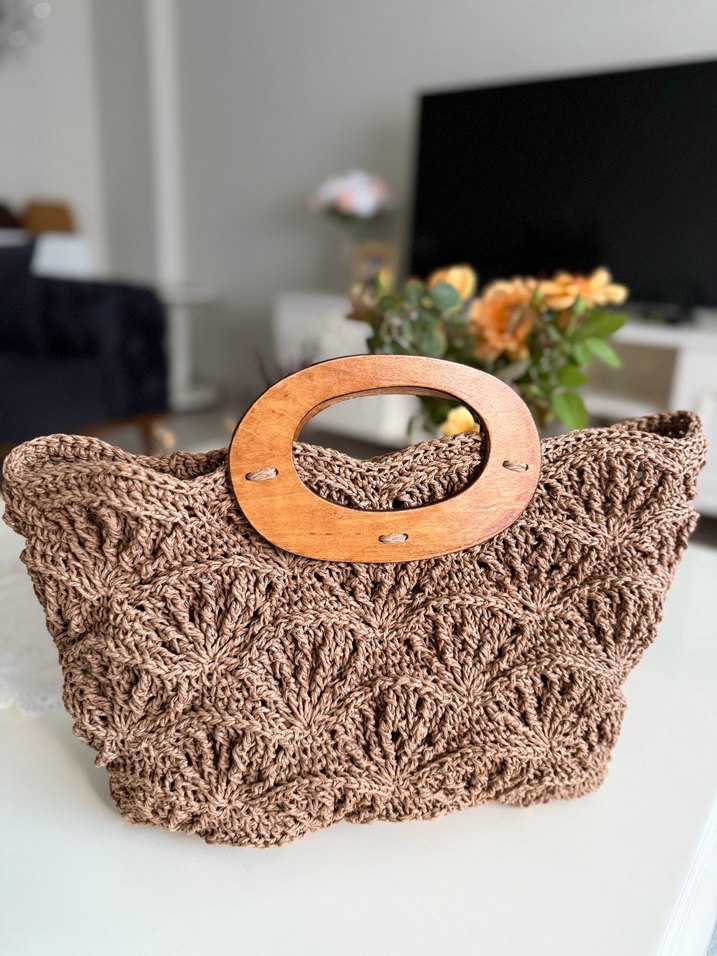 Kahverengi örgü kadın çanta, bohem tarzı ve ahşap saplı, yumuşak örgü kumaştan günlük kullanıma uygun.