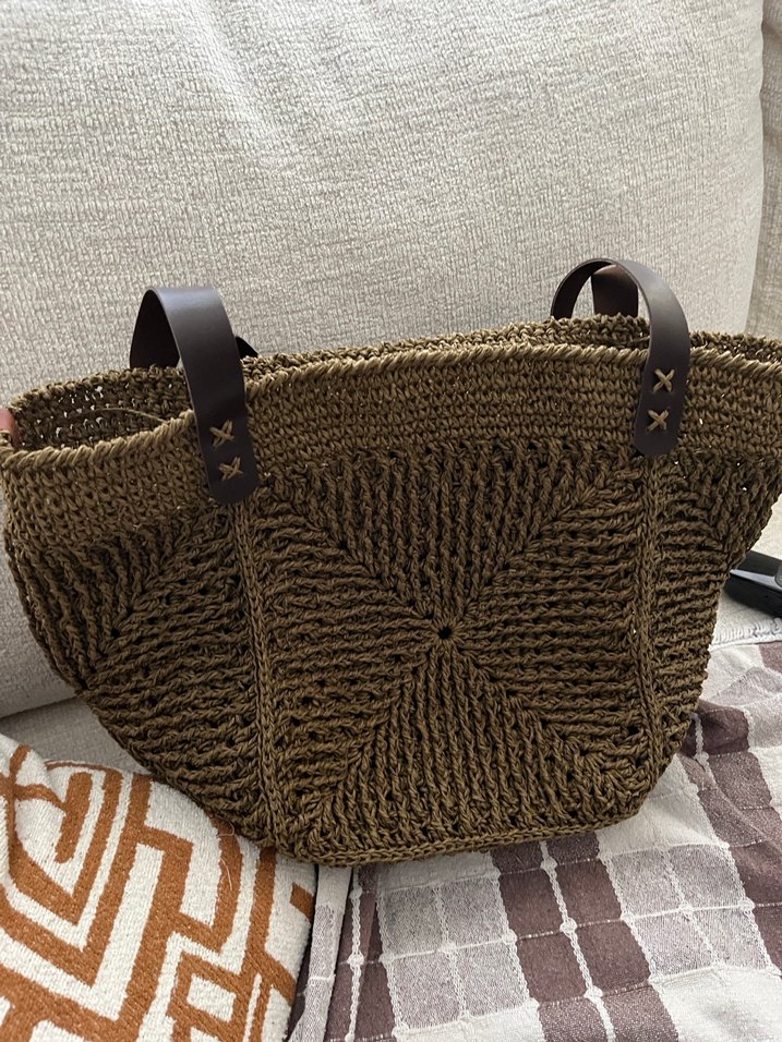 Bu kadın çantası, kahverengi örgü ve koyu renk saplarıyla bohem tarzda, rahat ve günlük kullanım için uygundur.