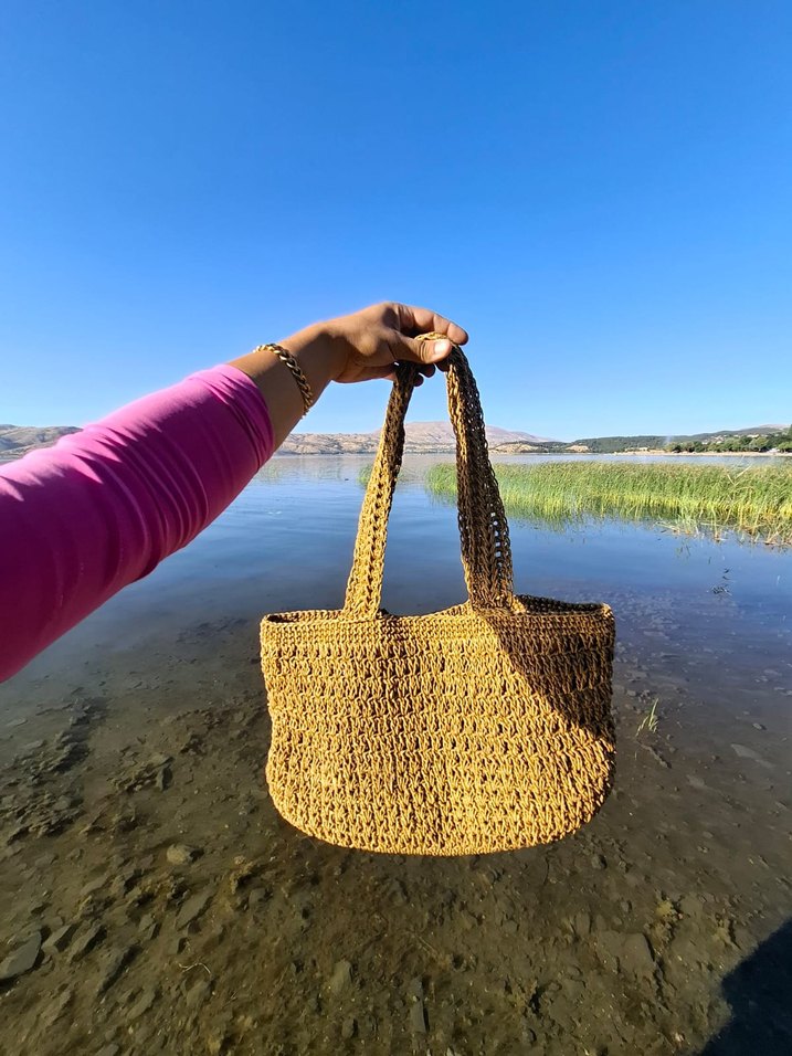Örgüden yapılmış, açık kahverengi bohem tarzda kadın çantası. Günlük kullanıma uygun, minimal tasarım .
