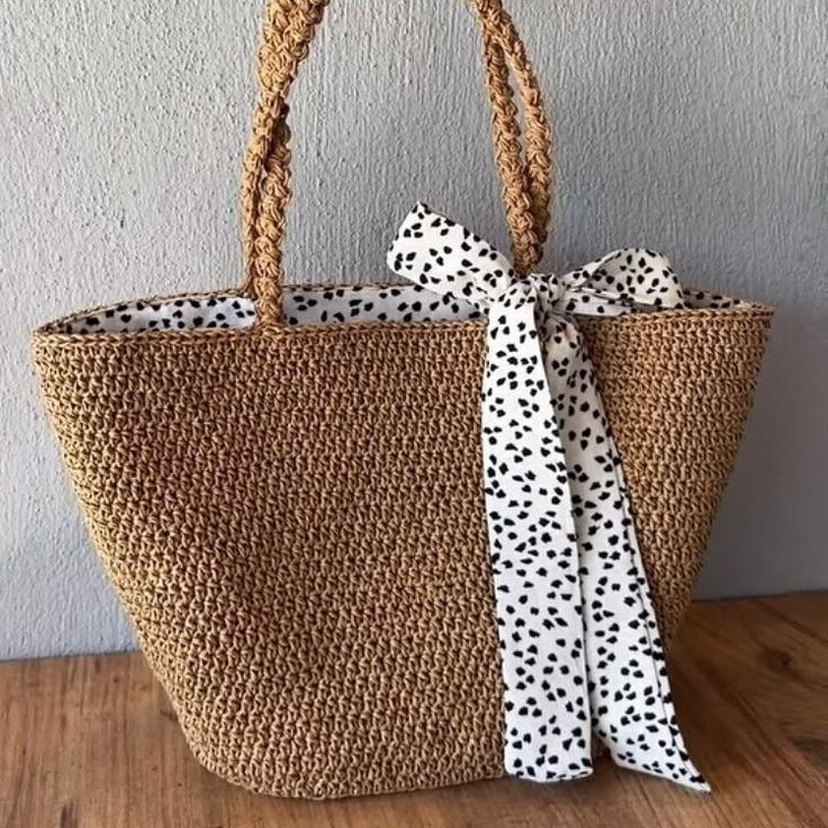 Yumuşak örgü dokulu kahverengi bohem kadın çanta, leopar desenli gri fiyonk ile minimalist tarzda günlük kullanıma uygun.