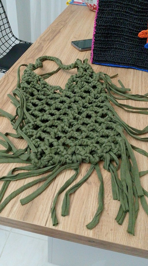 Yeşil renkli, örgü kumaştan yapılmış, püsküllü bohem tarzı kadın çantası. Günlük kullanıma uygundur.