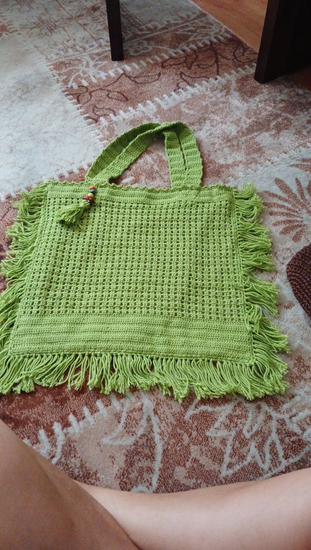 Yeşil renkli, püsküllü ve boncuklu detaylara sahip örgü bohem kadın çantasıdır. Günlük kullanıma uygundur.