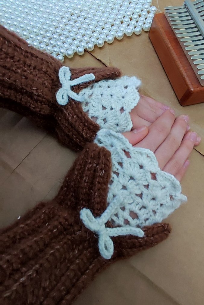 kahverengi, örgü bohem tarzda kadın eldiveni, pastel detaylarla sıcak ve nostaljik bir görünüm sunar.