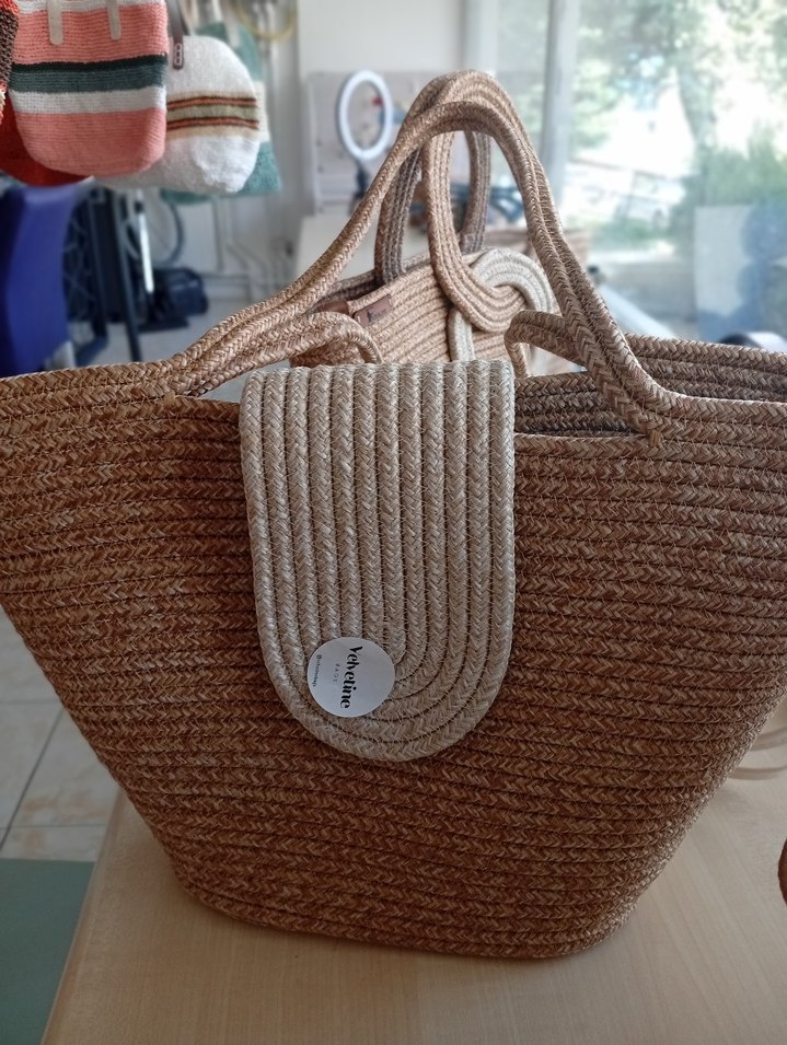 Sentetik kumaştan, örgü kahverengi plaj çantası. Minimalist bohem tarzda, açık renkli ve desensiz, kapak detayı bulunur.