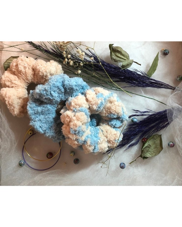 Yumuşak örgü kumaştan yapılmış, pastel mavi tonlarında bohem ve retro tarzı yansıtan örgü kadın saç tokaları.