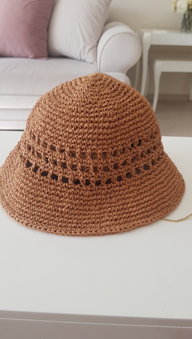 Kahverengi örgü bohem kadın şapka, açık işleme detaylarıyla retro ve renkli bir görünüm sunar.
