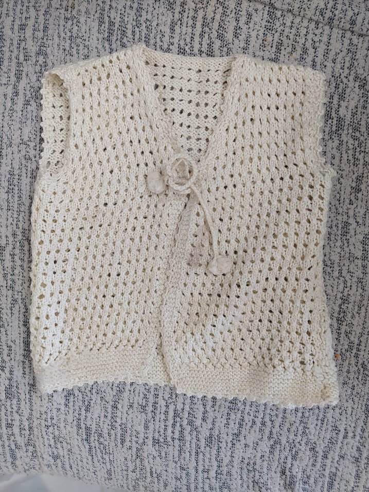 kiz çocuk için örgü, hafif bol kesim ve kolsuz süveter. V yaka ve ön bağlama detayına sahip. Beyaz rengiyle bohem ve retro tarzı yansıtıyor.