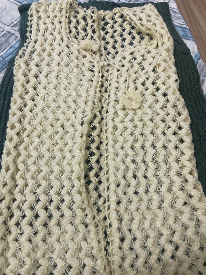 Kadınlar için örgü, bohem tarzda beyaz yelek . Açık örgü deseni ve çiçek detaylarıyla retro, hippie tarzını yansıtır.