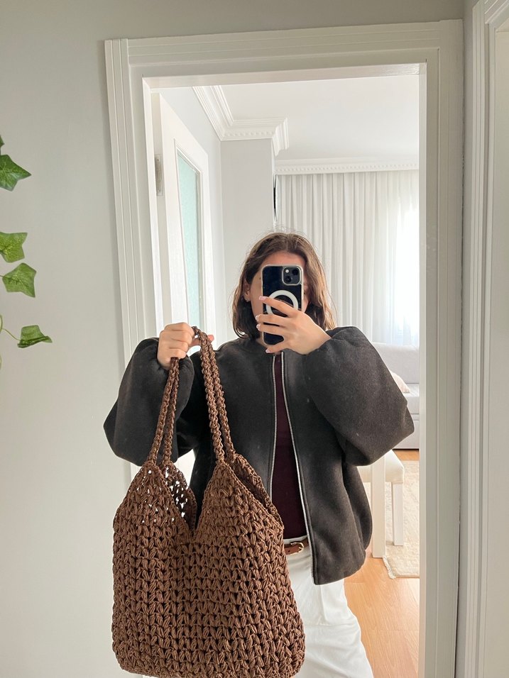 Koyu kahverengi, örgü dokulu kadın çantasıdır. Yumuşak örgü kumaşı ve bohem tarzıyla günlük kullanıma uygundur. Astarlı