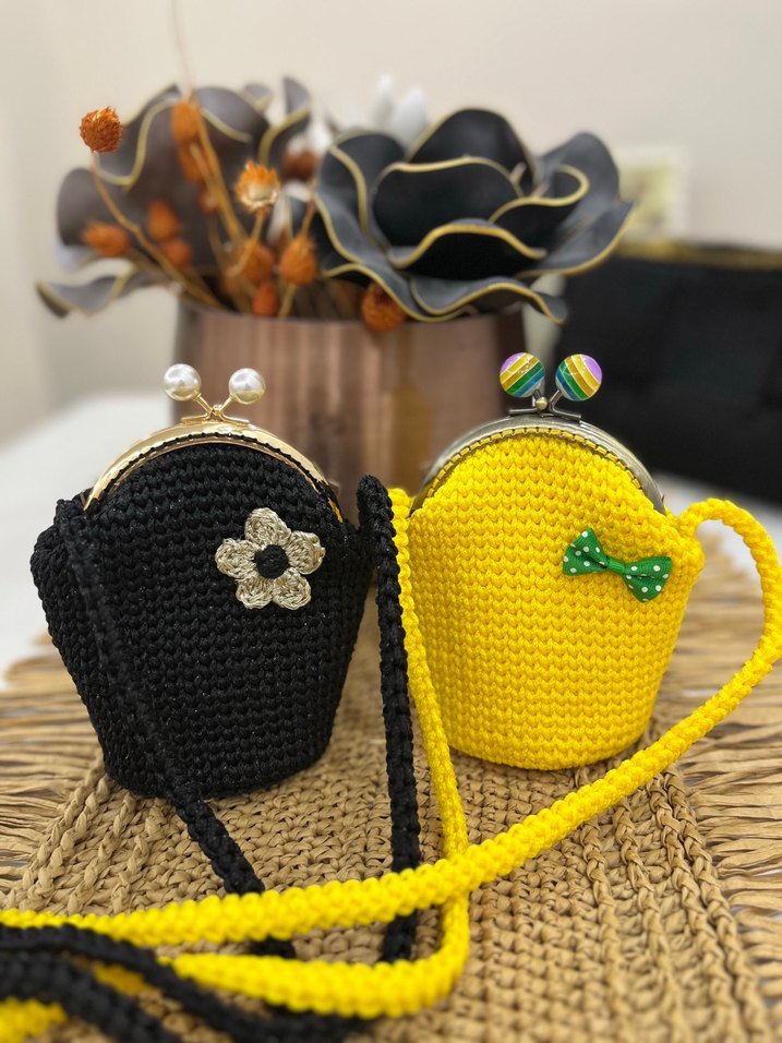 Renkli örgü çantalar, inci ve çizgili tokalarla süslenmiş. Sarı çantada yeşil fiyonk, siyahda çiçek nakışı var. Bohem tarz aksesuarlar.