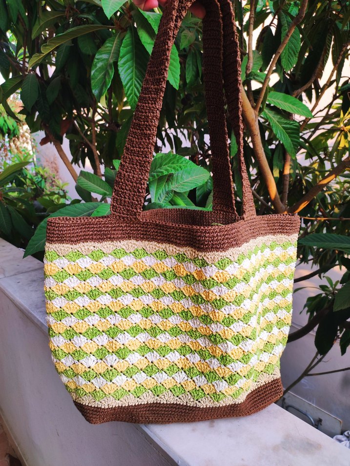Dantel detaylı, renkli yeşil desenli örgü bohem kol çantası, günlük kullanım için uygundur.