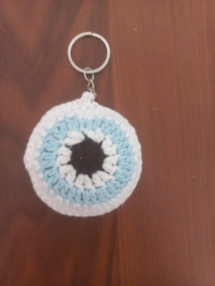 Örgüden yapılmış, açık mavi, beyaz ve siyah halkalardan oluşan bohem tarzda, retro ve hippie havası taşıyan rahat bir anahtarlık. satılmak için örülmüştür