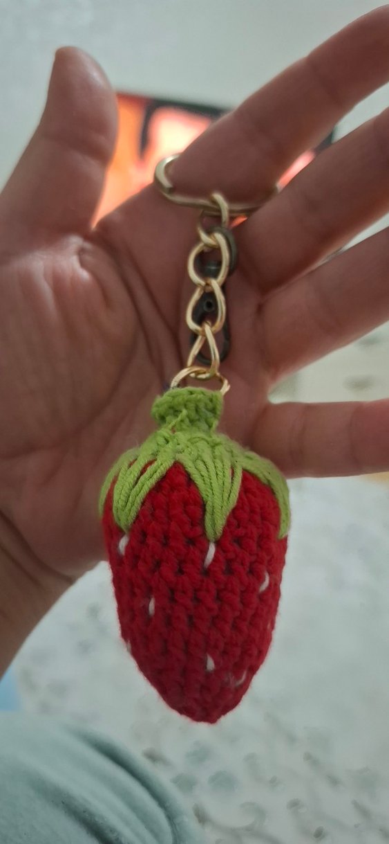 Renkli ve örgü bohem tarzda kırmızı çilek detaylı, yeşil yapraklı, sıcak ve retro bir anahtarlık.