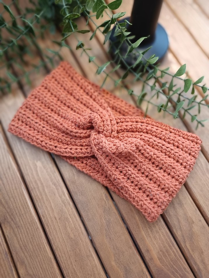 Turuncu renkte, kalın örgüden yapılmış, rahat ve bohem tarzda bir saç bandı.