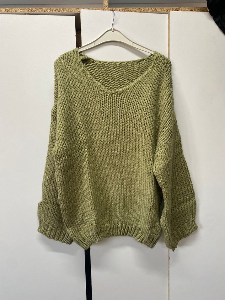Yeşil renkte, uzun kollu, yuvarlak yakalı ve salaş kesim örgü kadın kazak, rahat bohem tarzı için uygundur. Ürün sıfır ve etiketlidir her bedenden mevcuttur