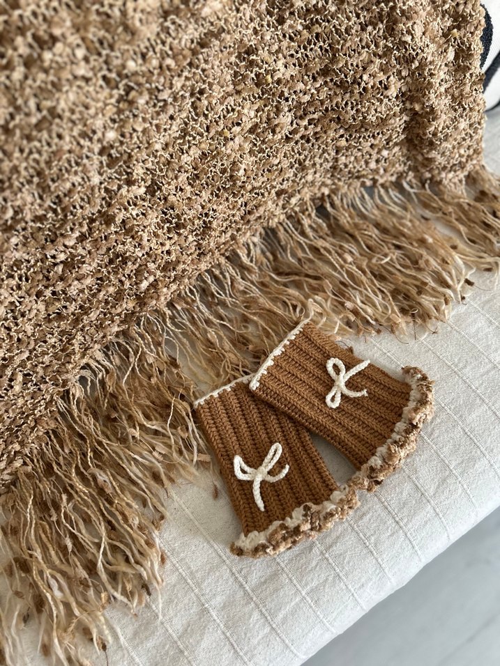 Açık kahverengi örgü, beyaz fiyonk detaylı bohem tarzı kadın eldiveni, rahat ve retro bir görünüm sağlar.
