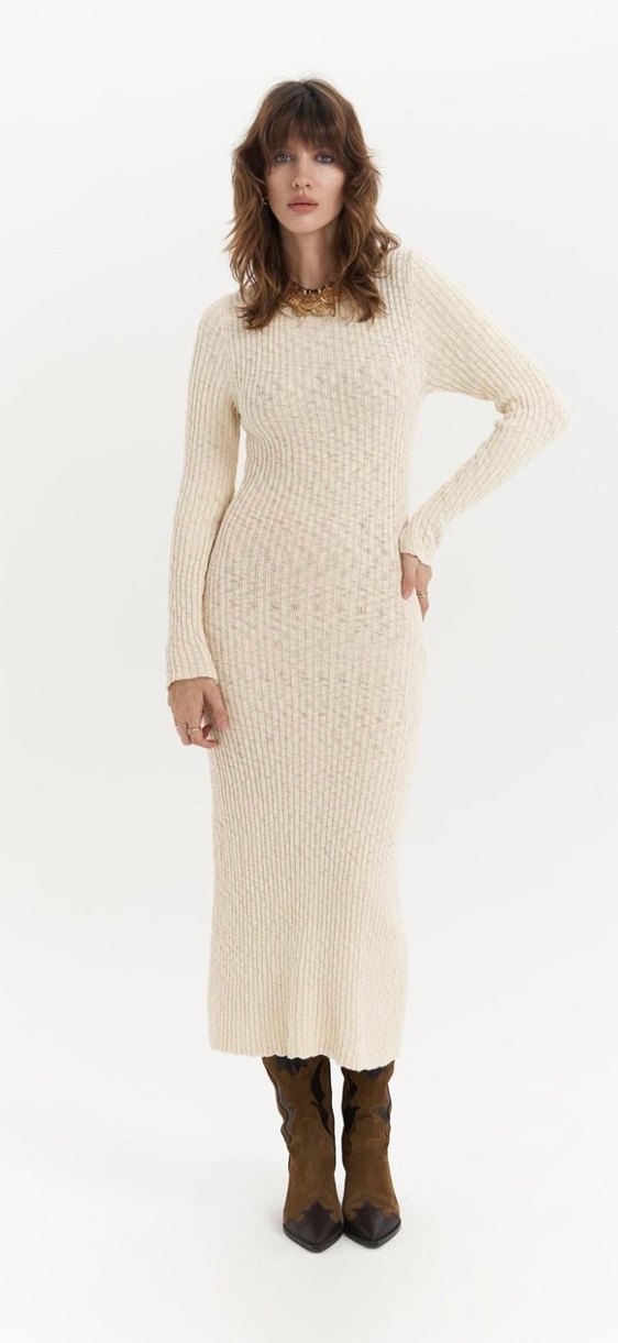 Bu uzun kollu, vücuda oturan kadın elbisesi, hafif beyaz renkte rahat örgü kumaş 1 kez giyildi
