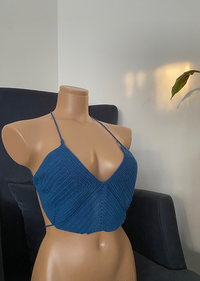 Ürün ince bikini ipinden örülmüştür. Sırttan bağlamalıdır. İncedir fakat göğüs pedi olmadan giyilebilir iç göstermez