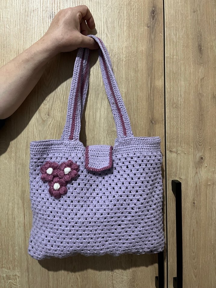 Mor renkte, dantel detaylı triko kadın çanta. Pastel tonları ve sade tasarımıyla bohem stil için uygundur. Günlük kullanıma idealdir. Yeni örüldü, hiç kullanılmadı. Eni: 30cm Boy: 23 cm