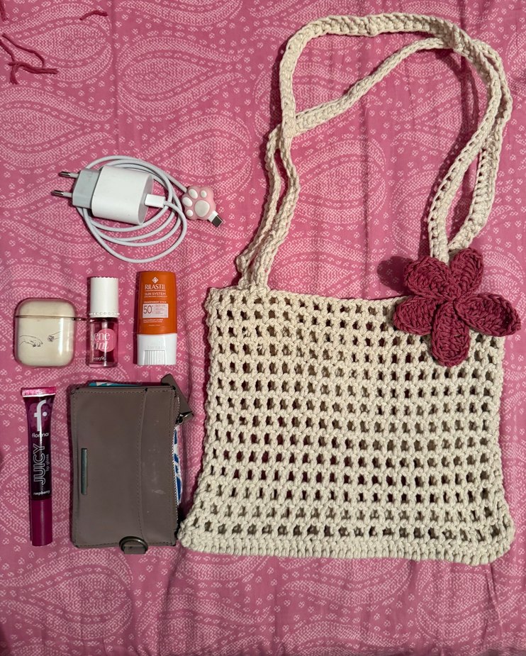 Pembe Çiçek Charmlı Fishnet Örgü Çanta