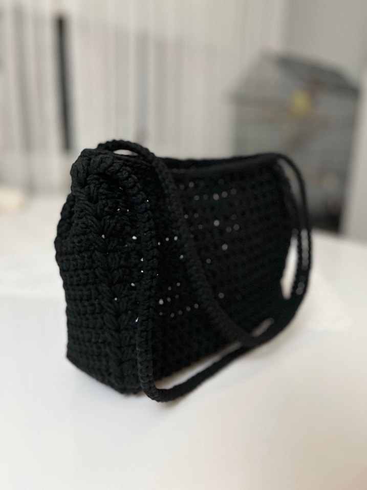 Siyah örgü pamuk makromeden yapılmış, minimalist ve gotik tarzda kadın çantası. Yumuşak dokulu ve günlük kullanıma uygun, avant-garde moda ile uyumlu.