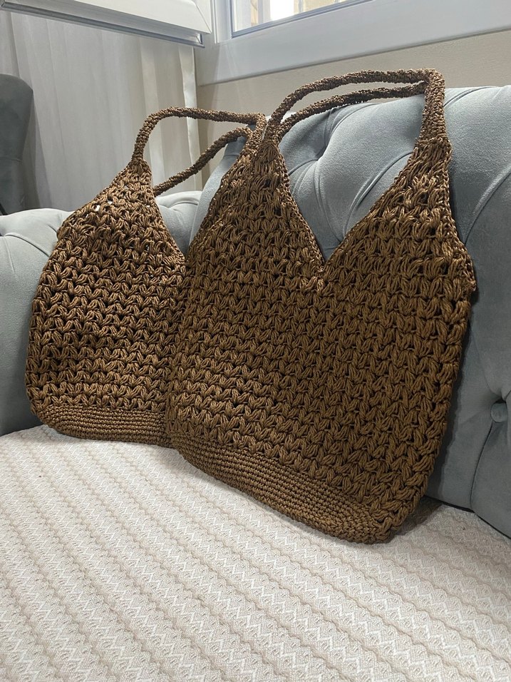 Bohem tarzda, örgü kahverengi kadın çanta, rahat ve günlük kullanıma uygun dokusu ile öne çıkar.