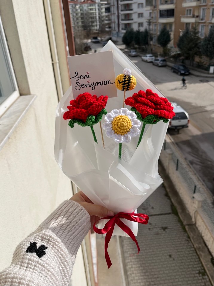 El yapımı kırmızı güller, beyaz papatya ve arıdan oluşan bohem tarzda çiçek buketi. Beyaz kağıda sarılı, kırmızı kurdeleli, üzerinde 'Seni Seviyorum' notu bulunur. Sipariş için ilan açtırınız.