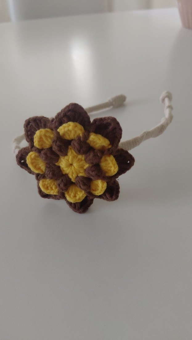 Kahverengi ve sarı renklerde örgü çiçek deseniyle bohem stil saç bandı.