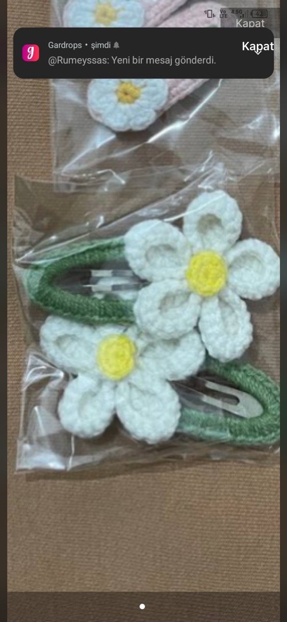 Örgü beyaz çiçek desenli çocuk tokaları, pastel renklerde, bohem tarzını yansıtır.