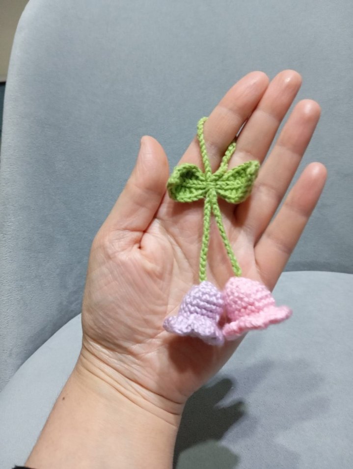 Pastel renklerde, yeşil yapraklı örgü çiçeklerden oluşan bohem tarzda anahtarlık. Yumuşak ve rahat bir tasarım.