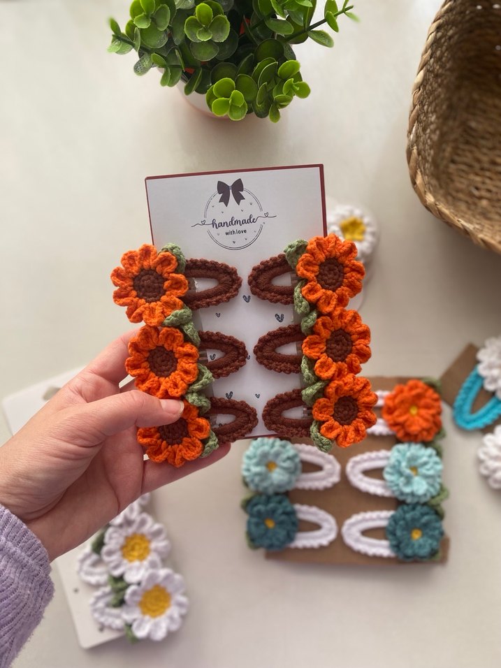 Bohem tarzda örgü, renkli kahverengi ve turuncu çiçek desenli çocuk saç tokası seti. Çift fiyatıdır