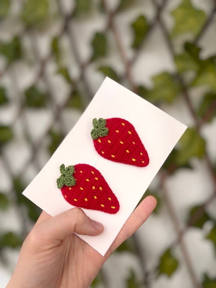 Örgü kırmızı çilek şeklinde, renkli baskılı detaylara sahip çocuk saç tokası seti, bohem stil için uygundur.