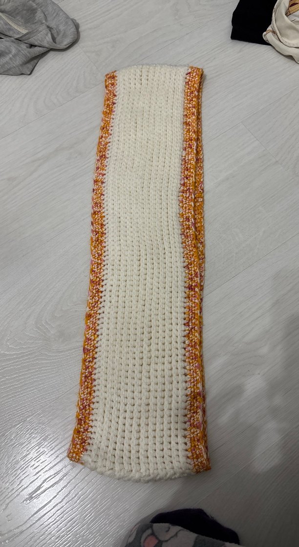Örgü örnekli, beyaz ve turuncu kenarlıklı bohem tarzı çocuk atkı , yumuşak dokusuyla retro ve hippie görünüme uygundur.