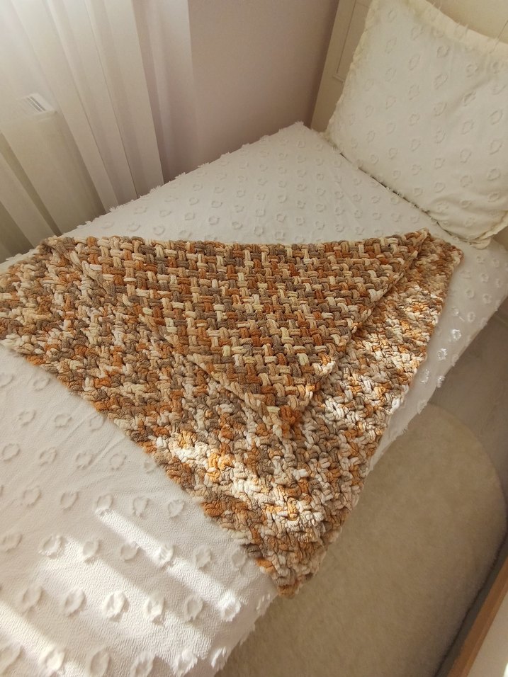 Bu örgü çocuk battaniyesi, yumuşak dokusu ve açık rengiyle konfor sağlar.