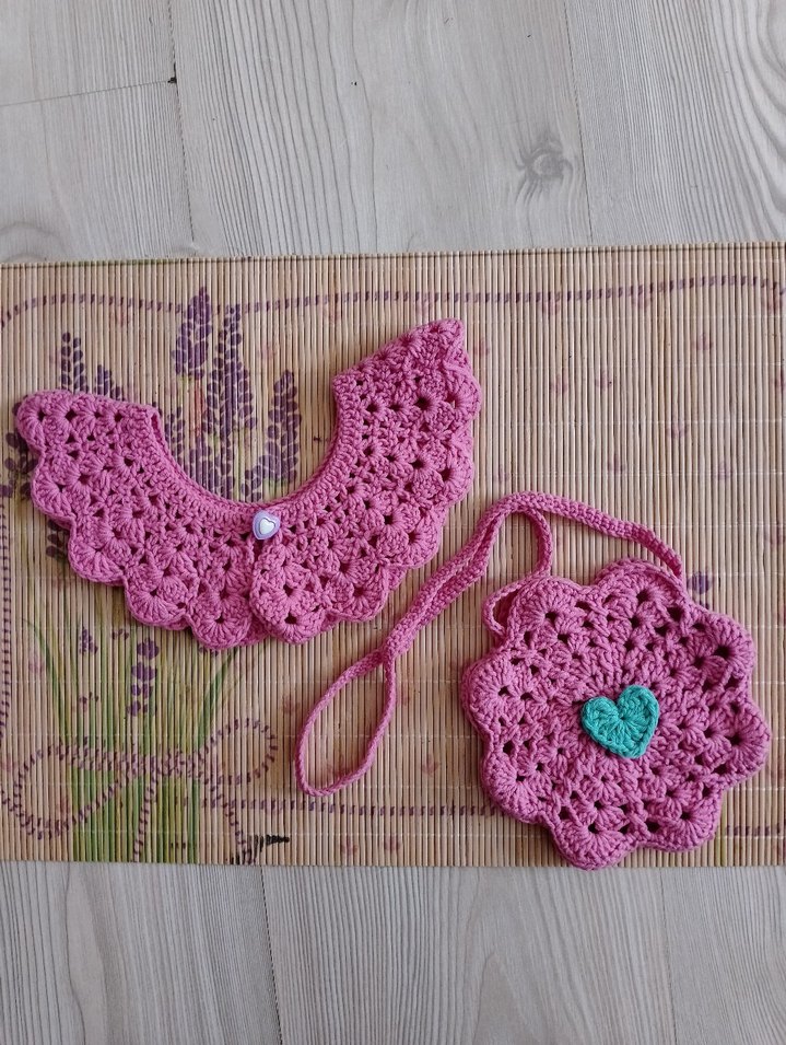 Pembe dantelden yapılmış bohem tarzda yakalık ve turkuaz kalp işlemeli küçük çanta seti.