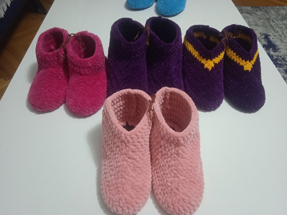 Kadife iple örülmüş, tabanlı çocuk patikleri. Tanesi 350 liradır.