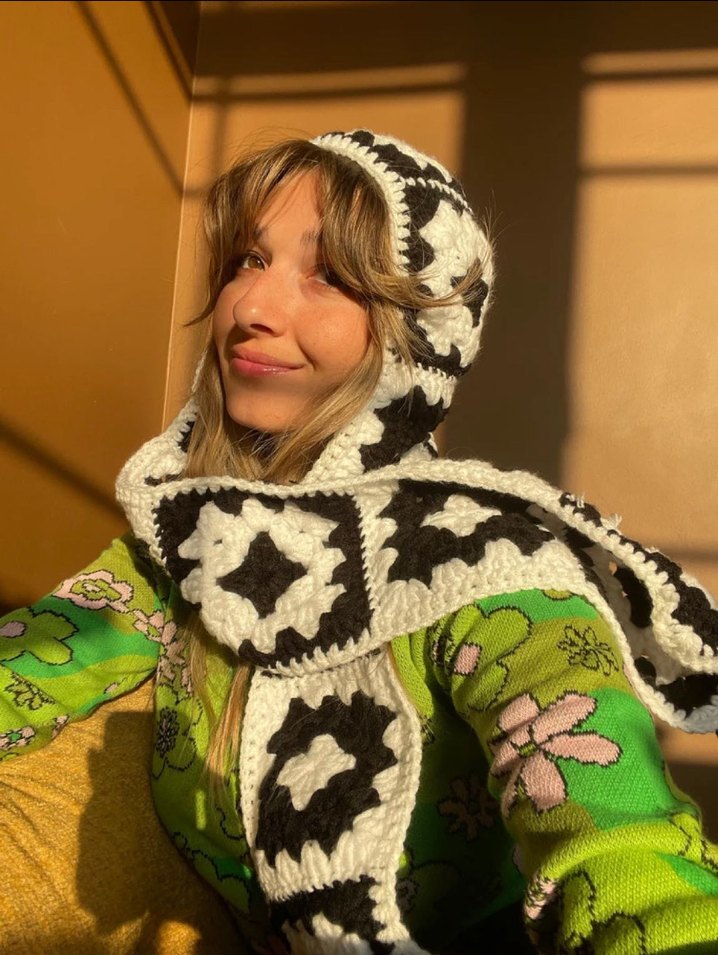 Bu örgü kadın bere, hafif çok renkli desenlere sahip olup rahat ve retro tarzdadır. Bohem tasarımıyla karşı kültür görünümüne uygundur.
