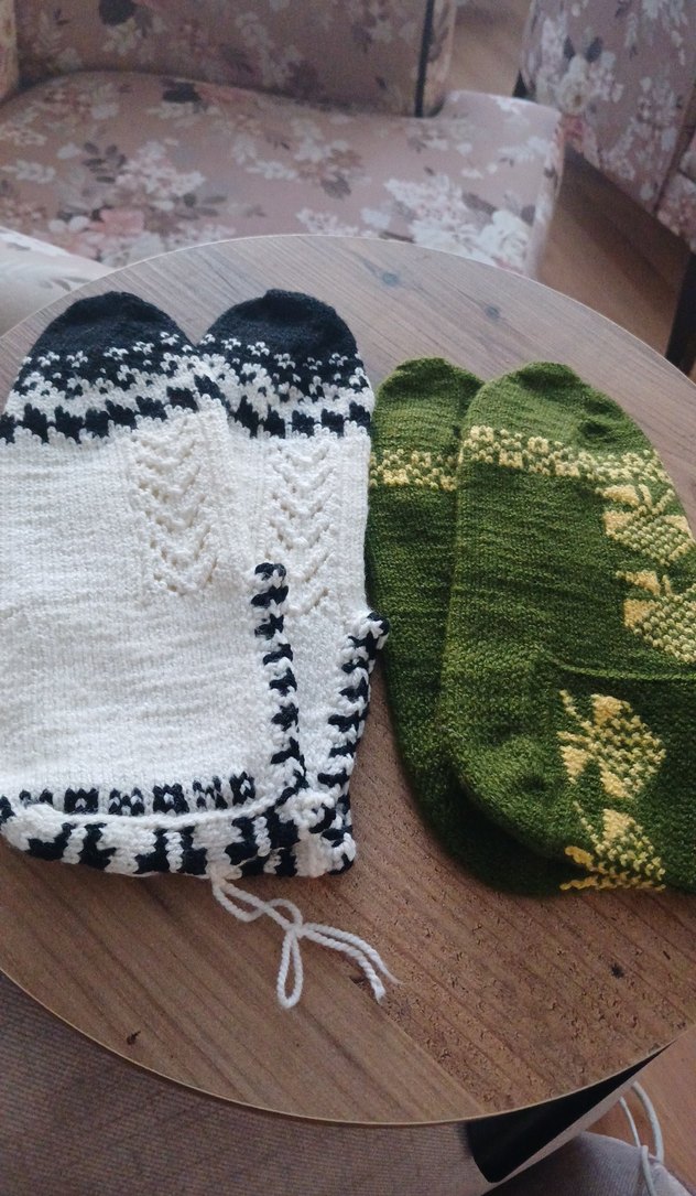 İki çift örgü çorap, biri açık desenli koyu yeşil, diğeri siyah detaylı beyaz, sıcaklık ve rahatlık sağlar.