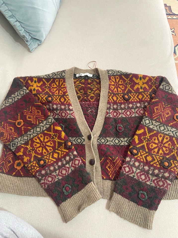 Çok renkli desenli, uzun kollu, yuvarlak yakalı, bol kesim örgü kadın hırkası, rahat günlük kullanım için uygundur. Mert Aslan koleksiyonundan kazak 1 kez giyildi temizdir hiç bir sorunu yoktur #mertaslan# #zara# #mango# #bershka# #hm# #stradivarius# #ipekyol# #twist# #network#hırka# #zara#