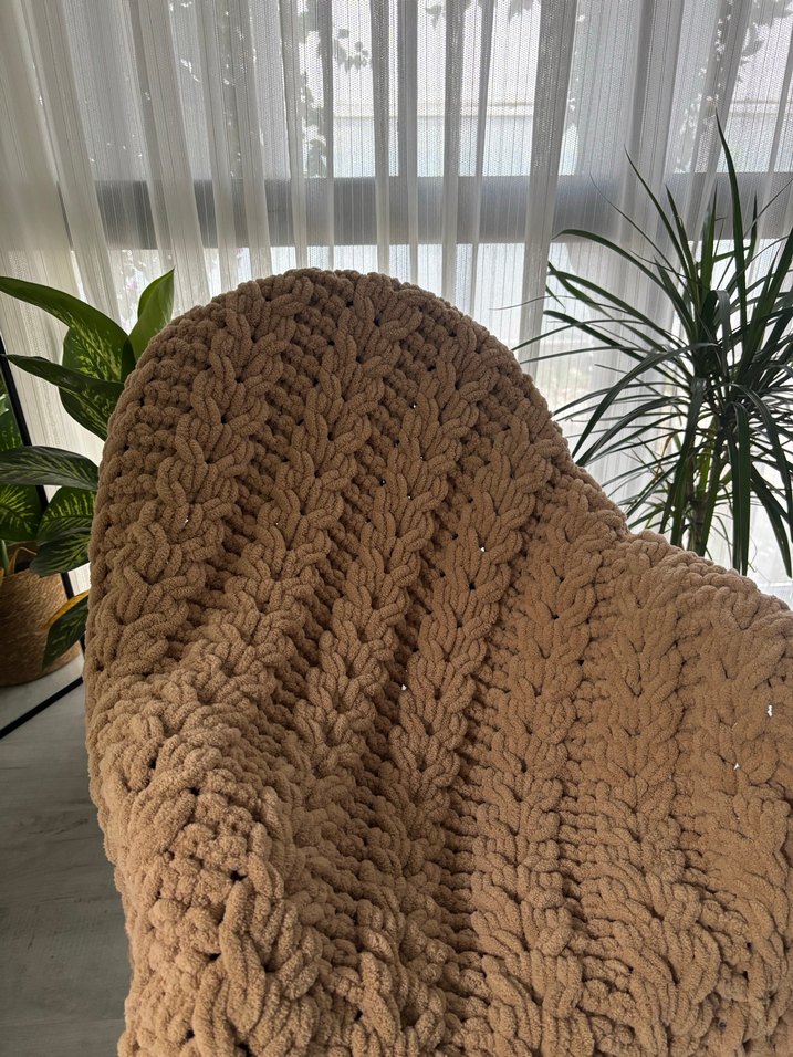 Bu kahverengi örgü çocuk battaniyesi, kalın örgü desenine sahiptir ve sıcaklık ile konfor sunar. Yumuşak dokusuyla çocuklar için rahattır.