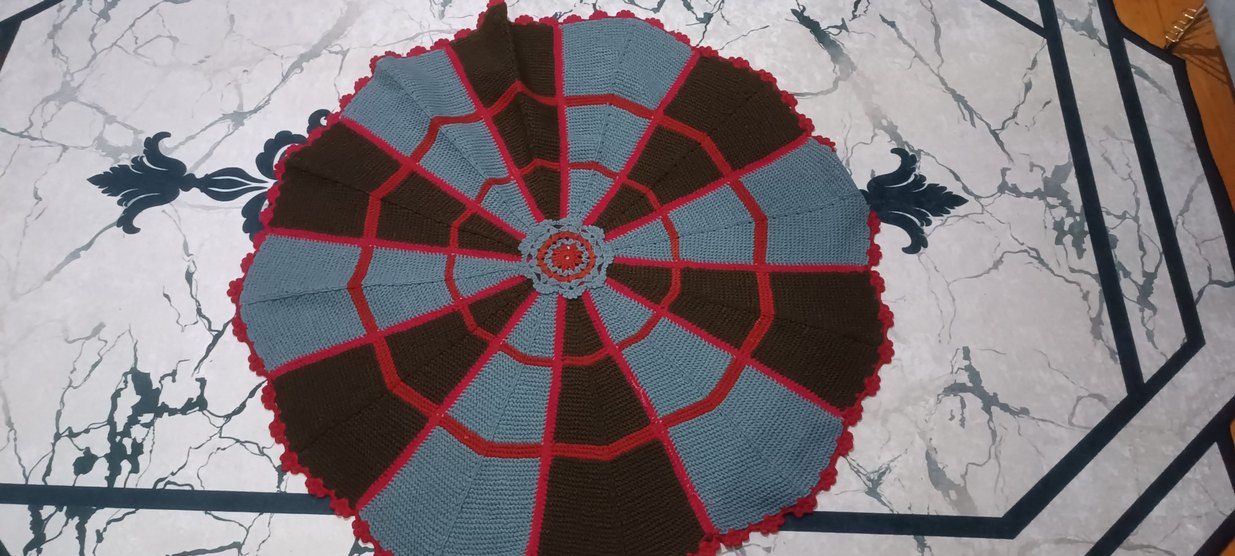 Bu battaniye, koyu çok renkli bölümlerle desenli ve yumuşak örme dokusuna sahip.