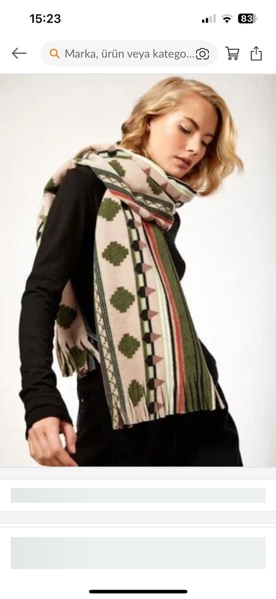 Örgü dokusuyla çok renkli ve açık tonlarda, geometrik desenler ve çizgiler taşıyan bohem tarzda kadın şalı.