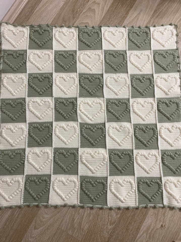Örgü kumaştan yapılmış, ekose desenli, her karede kalp detayları bulunan khaki ve gri renklerde çocuk battaniyesi. Yumuşak ve rahat bir dokusu vardır.