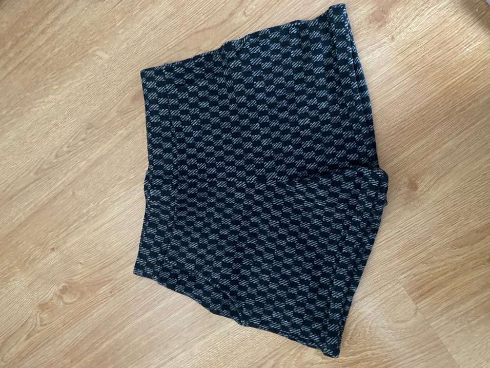 Gri renkte, örgü dokulu, yüksek bel, bol kesim ve mini boy kadın şort, günlük sokak stiline uygundur.